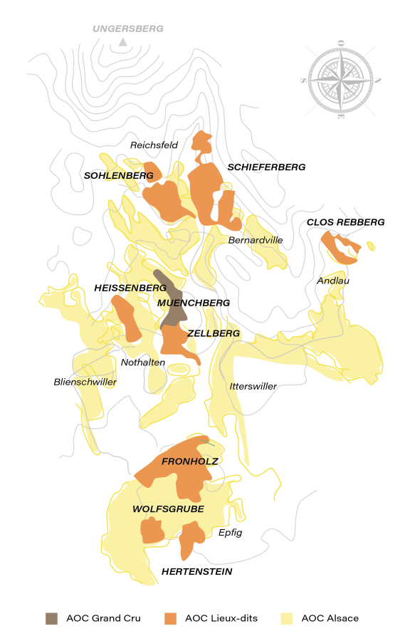Le Grand Cru Muenchberg, littéralement « colline des moines », tire son nom des moines cisterciens de l’abbaye de Baumgarten, qui cultivaient déjà la vigne sur ses coteaux dès le XIIe siècle.